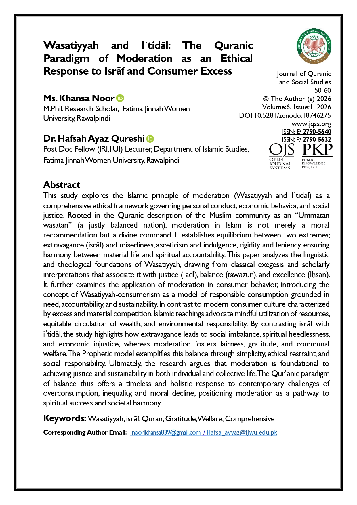 Noor, Ms. Khansa, and Dr. Hafsah Ayaz Qureshi. 2026. “Wasatiyyah and Iʿtidāl: The Quranic Paradigm of Moderation As an Ethical Response to Isrāf and Consumer Excess”. Journal of Quranic and Social Studies 6 (1, Jan– April):50-60. https://doi.org/10.5281/zenodo.18746275.